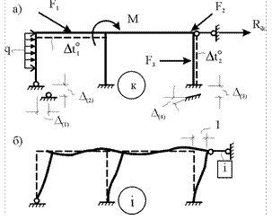 Пусть требуется определить реакцию Rik в i-й связи заданного сооружения (рис. 30.6,а), испытывающего в k-м равновесном состоянии любые внешние воздействия (силовые, температурные, кинематические).
