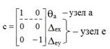 Элементы матрицы c должны описывать перемещения узлов в основной системе метода перемещений в направлении узловых сосредоточенных сил и сосредоточенных моментов, включенных в матрицу F, от единичных смещений наложенных связей. Для формирования матрицы c используем деформационные схемы рамы в основной системе метода перемещений, полученные от смещения наложенных связей на величину, равную единице (рис. 30.11,б,в). Первый столбец этой матрицы включает в себя угол поворота узла а, горизонтальное и вертикальное перемещение узла e от единичного поворота угловой связи (рис. 30.11,б), второй – эти же перемещения от единичного смещения линейной связи (рис. 30.11,в). Поворот узла по часовой стрелке в соответствии с принятым знаком для узловых сосредоточенных моментов считается положительным, знаки же линейных перемещений узлов привязываются к ранее принятой системе координат (рис. 30.13).