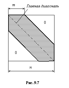 Во-первых, при рациональной нумерации узлов матрица коэффициентов СЛАУ имеет ленточную структуру. Это означает, что ненулевые коэффициенты матрицы содержатся только в пределах некоторой полосы – ленты, занимающей диагональное положение в матрице (рис. 9.7).