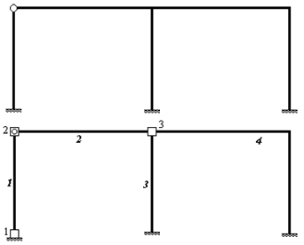 В конечно-элементной схеме балки (рис.9.15) используется один жесткий и три шарнирных узла. Следовательно, в соответствии с (9.3) эта схема характеризуется 3×2+1×3=9 степенями свободы.