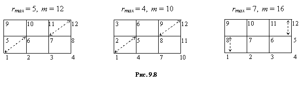 Здесь rmax – величина наибольшей разности между глобальными номерами узлов в пределах каждого КЭ, определяемая при обходе по всем элементам системы; ns – число степеней свободы узла. Для уменьшения ширины ленты следует стремиться к оптимальной нумерации узлов, при которой параметр rmax принимает минимальное значение. Пример разбивки двумерной области на прямоугольные элементы с разными вариантами нумерации узлов приведен на рис. 9.8. Рациональная нумерация узлов дает m = 10, а нерациональная – m = 16 (при ns = 2).