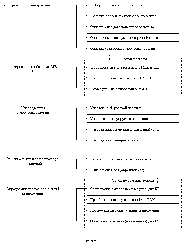 Основные этапы статического расчета конструкций МКЭ и последовательность их выполнения приведены в виде схемы на рис. 9.9.