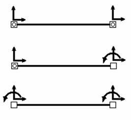 На рис.9.13 первый элемент характеризуется четырьмя степенями свободы, т.к. он содержит два шарнирных узла. При отсутствии нагрузки, кроме приложенной в самих узлах, положение на плоскости любой точки этого элемента определяется четырьмя параметрами - двумя вертикальными и двумя горизонтальными перемещениями узлов элемента. У второго элемента на рис.9.9 - пять степеней свободы - к четырем линейным смещениям добавляется поворот в одном из узлов. У третьего элемента - шесть степеней свободы, которым соответствуют четыре линейных и два угловых перемещения.