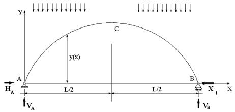 Такая арка является один раз статически неопределимой. Действительно, в ее опорах возникают четыре реакции - две вертикальных и две горизонтальных, а уравнений равновесия для арки можно составить только три.