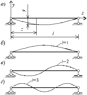 В зависимости от значения i = 1,2,... по формуле (14.56) определяется спектр частот собственных колебаний соответствующий собственным формам, показанным на рис.14.13, б, в, г. Упругая линия балки, учитывая, что C2 = C3 = C4 = 0, при i-ой форме колебаний имеет вид: