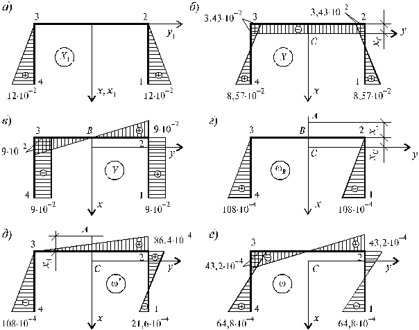 Для вычисления главных центральных моментов инерции предварительно построим эпюру координат x и y (рис.15.9, б, в). С применением этих эпюр, определяются: