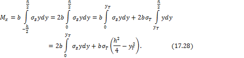 Рассмотрим упруго-пластический чистый изгиб бруса. Для простоты предполагается, что поперечное сечение бруса обладает двумя осями симметрии (рис.17.3, а) и что диаграмма деформирования материала при одноосном сжатии и растяжении одинаковы (рис.17.3, б). При принятых предположениях следует полагать, что нейтральная линия совпадает с осью симметрии x (рис.17.3, а)