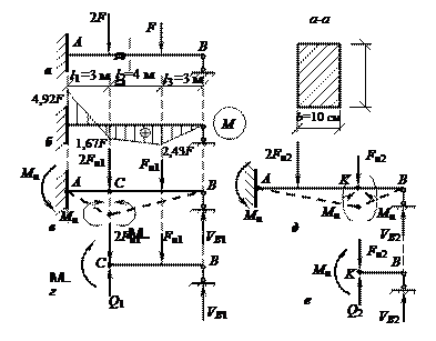 Первый механизм разрушения. Предположим, что пластические шарниры образовались в заделке и в сечении на расстоянии l1 = 3 м от заделки (рис. 83.18, в).