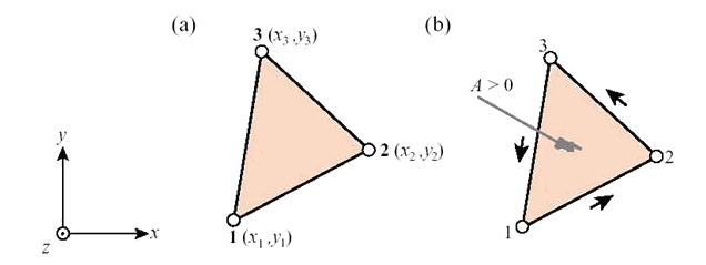 Рис. 9.57. Линейный треугольный конечный элемент: (а) – геометрия элемента; (б) – положительное направление обхода контура элемента.
