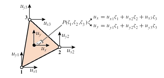 Рис. 9.59. Интерполяция перемещений в пределах треугольного линейного конечного элемента.