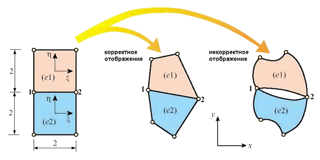 Соотношения типа (9.124) или (9.125) носят название изопараметрического отображения. Вопрос корректности отображения может быть достаточно острым при расчетах методом конечных элементов. Необходимо правильное построение сетки конечных элементов, чтобы не было нарушения взаимооднозначности отображения (Рис. 9.65).