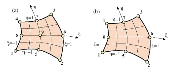 Рис. 9.68. Четырехсторонние конечные элементы высшего порядка: (а) девяти-узловой биквадратичный элемент; (б) восьми-узловой «серендипов» элемент.