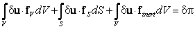 Интегралы слева представляют собой работы внешних объемных и поверхностных сил, а также сил инерции на возможных перемещениях.