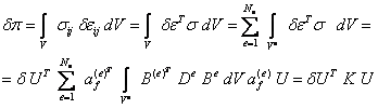 и подставляя затем в данное равенство полученные выше выражения элементарной работы и вариации энергии деформации, сравнивая выражения слева и справа, получим следующее матричное уравнение: