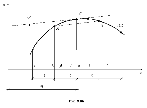 Изложим основные положения МКР на примере одномерной задачи. Пусть, например, υ(x) есть уравнение изогнутой оси балки (рис. 9.86). Точное значение производной в точке С будет равно