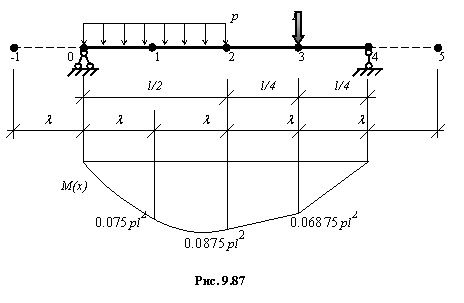Здесь для записи четвертых разностей введены так называемые законтурные узлы -1 и 5, находящиеся вне расчетной области балки. Их можно исключить с помощью граничных условий (на опорах). Так, на левой опоре (узел 0):
